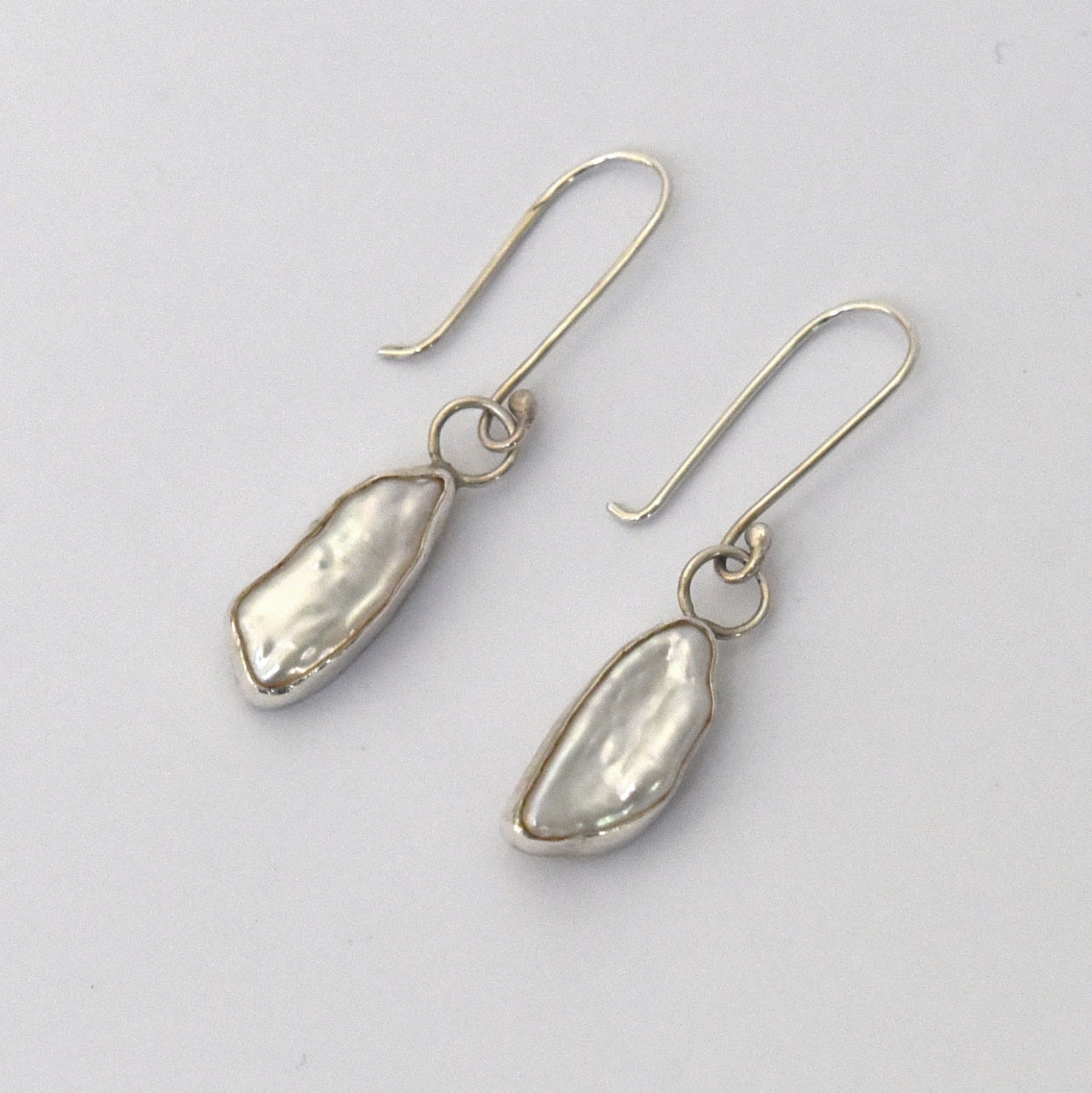 Sterling silver bezel set pearl earrings, one of a kind design. Length approx. 4 cm including hooks.